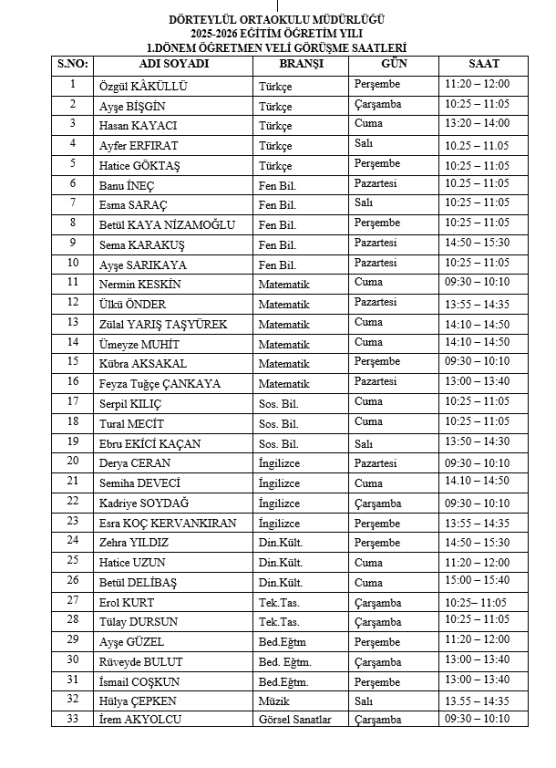 Sayın velilerimizden hem kendi çocuklarının hemde diğer çocukların eğitim öğretim zamanından vakit çalınmaması için aşağıdaki öğretmen-veli görüşme saatlerine titizlik ve anlayış göstermelerini bekliyoruz. Öğretmenlerimiz teneffüs aralarında ve öğle yemeği tatilinde veli görüşmesi yapmayacaklardır.